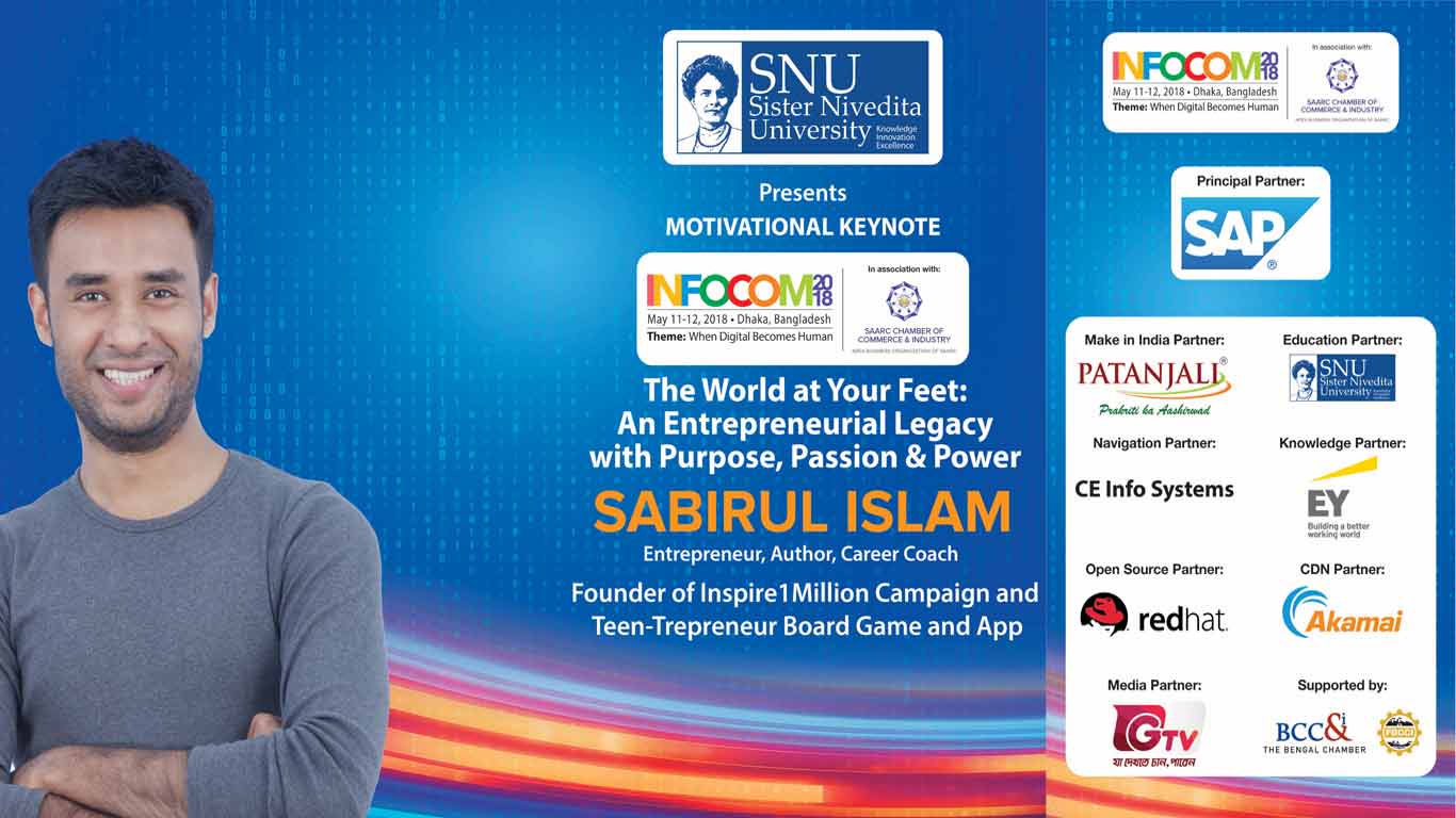 Sister Nivedita University, the Education Partner of INFOCOM 2018 presents the Motivational Keynote: The World at Your Feet: An Entrepreneurial Legacy with Purpose, Passion & Power by Sabirul Islam, Entrepreneur, Author, Career Coach at Dhaka, Bangladesh on 11th & 12th May.